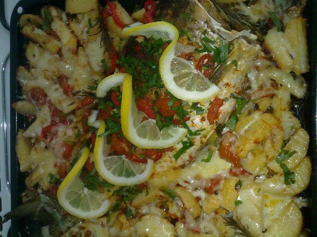 La finalizarea preparatului se aseaza pe o tava frunze de salata verde pestele pe mijloc ornamentat cu patrunjel verde si lamaie dejur imprejur se pune garnitura de cartofi ornate cu o ploaie de cascaval.