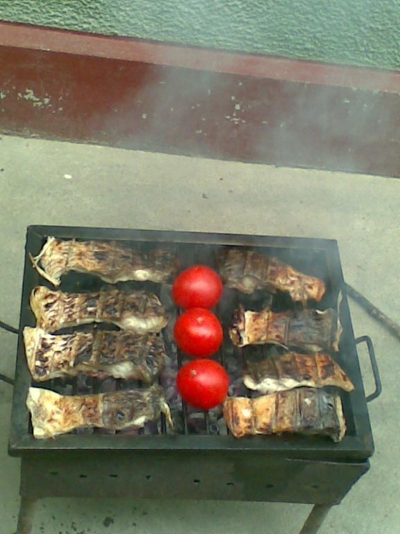 Se curata crapul de solzi si se eviscereaza, se spala bine, se taie in bucati potrivite. Intr-un vas punem vinul cu o lingura de sare si o lingurita piper si il amestecam bine, apoi introducem pestele si il lasam cam o ora la frigider. Apoi se aseaza pe gratarul bine incins, dupa ce ati intors pestele se stropeste cu vinul ramas in vas de la peste. Intre timp ce pestele este pe gratar putem adauga si rosiile sa se coaca. Se curata rosiile de coaje si se piseaza inpreuna cu cateii de usturoi si se freaca bine bine cu putin ulei si sare, pina se omogenizeaza. Pestele se serveste cald inpreuna cu mujdeiul de usturoi cu rosii si lamiie... pofta buna