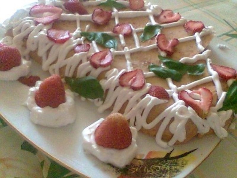 Freci zaharul cu galbenusurile, adaugi laptele clocotit si freci compozitia la bain-marie pana se ingroasa. dai la o parte si adaugi gelatina topita in putina apa calduta. Se amesteca pana se raceste, adaugi capsunile zdrobite la blender, albusurile batute spuma separat, si esenta de rom. Crema obtinuta se toarna intr-o forma(tava de chec sau un vas de yena)si se da la frigider un timp. Cand vrei sa o consumi tii forma in apa clocotita timp de cateva secunde si o rastorni pe un platou. Se orneaza cu frisca si cateva capsuni.
