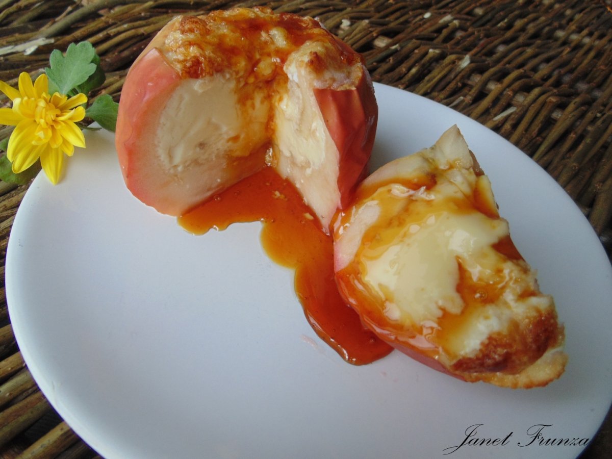 Mai intai pregatim merele. In partea de deasupra taiem un capac, apoi cu ajutorul unei linguri de metal, scobim usor merele, sa nu le spargem, pana cand avem o cupa. Peretii sa nu ramana subtiri, pentru ca la copt se vor crapa.