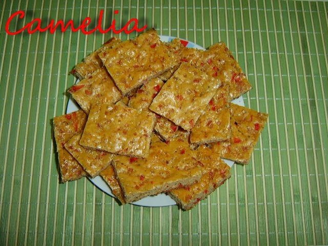 Se dizolva drojdia in apa calda.Se taie sunca si ardeiul in cubulete. Se cerne faina intr-un castron, iar in mijloc se face o adancitura in care se pune laptele caldut, drojdia, mierea, sarea, uleiul, oregano, sunca si areiul.Se amesteca ingredientele pana se obtine un aluat omogen, care se lasa la dospit timp de 60 de minute. Se unge cu ulei si se tapeteaza cu hartie de copt tava aragazului. Se intinde aluatul sub forma unui dreptunghi cu grosimea de 1,5 cm. Se aseaza aluatul in tava si, cu ajutorul furculitei, se inteapa si se traseaza dungi oblice, in ambele sensuri. Se unge cu ou batut si se lasa aluatul la crescut inca o ora. Se introduce tava in cuptorul preincalzit, pentru 40-45 de minute. Se taie calduta in dreptunghiuri.