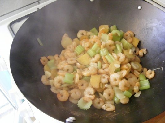 Se taie bucati potrivite telina, ghimbirul si usturoiul. Se pune intr-o cratita ulei la incins, se adauga crevetii, telina, ghimbirul si usturoiul. Se adauga sare si piper dupa gust. Se amesteca din cand in cand pana cand crevetii capata o nuanta rosie. Se servesc calzi.