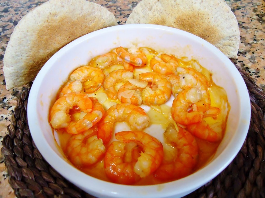 Eu i-am impartit pentru 2 portii.Se curata crevetii,si se impart in 2 recipiente micute pentru cuptor.Usturoiul se curata si se taie in feliute subtiri(cate 2 pentru fiecare portie).Se adauga peste creveti,impreuna cu uleiul de masline(cate 2 linguri pt fiecare)si 2,3 picaturi de ulei picant.Se dau la cuptorul incins la 220ºC,timp de 10-15min.Se servesc calzi,alaturi de o painica lipie.Se mai pot adauga si scoici curatate.Chiar daca pare un platou micut,este destul de consistent.Este absolut delicios!Sper sa va placa!POFTA BUNA!!!