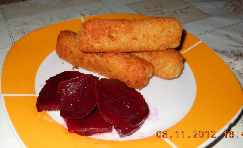 Cartofii raciti se trec prin presa sau se sfarama cu furculita, se pune cascavalul ras, parmezanul, faina, nucsoara , sare si piper si cele 2 galbenusuri. Se formeaza un sul lung din care se taie bucati cat mai egale. Se modeleaza crochete, se trec pe rand prin albusul batut putin si apoi prin pesmet si se prajesc in ulei fierbinte. ( Nu se lasa crocheta in albus pt ca se inmoaie, din acelasi motiv se fac pe rand). Se scot pe servetele absorbante. Se servesc cu felii de sfecla rosie.
