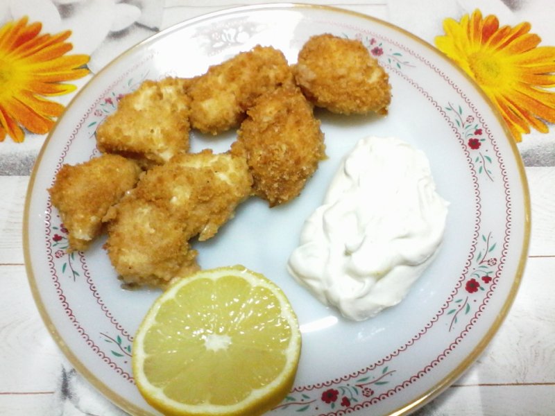 In blender punem ulei, zeama de lamaie, sare, piper si mustar si amestecam bine. Punem aceasta compozitie in bol. Taiem pieptul de pui bucatele (cat de mari sau mici doriti), bagam fiecare bucatica de piept in bolul cu ulei si apoi o tavalim prin pesmet, punem in tava una linga alta si lasam la frigider 2-3 ore. Preincalzim cuptorul la 180 de grade si coacem pentru 20-25 de minute