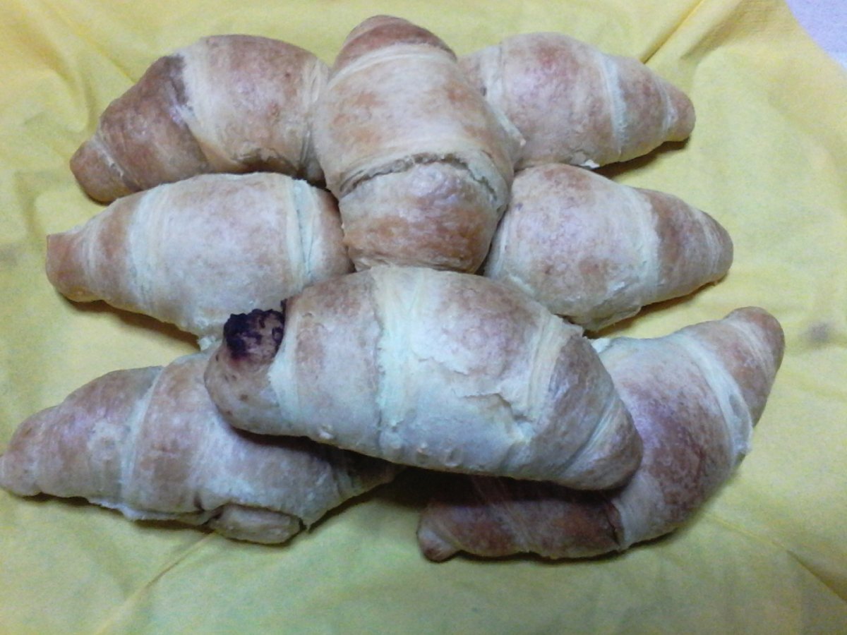 Întinzi aluatul într-o foaie dreptunghiulară de aproximativ 40 cm pe 25 cm pe care o tai în triunghiuri pentru a le rula apoi în formă de croissant. Amestecam nuttela cu nuca macinata si stafide si umplem croissantele.