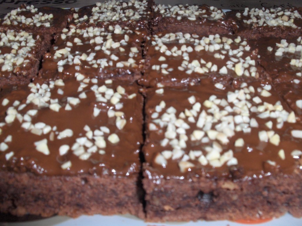 Intre timp se topeste ciocolata ruptã bucãti, impreunã cu putin ulei sau unt.Se intinde imediat peste prãjiturã.Deasupra am pus alune tocate apoi am tãiat cubulete.