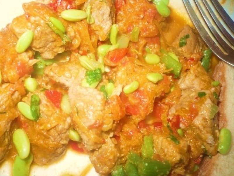 Se pune la fiert o oala cu apa si deasupra o strecuratoare mare pe care asezam cuburile de carne de vitel. Separat oparim fasolea in apa cu sare si apoi o strecuram si o punem repede in apa rece cu cuburi de gheata ca sa nu-si piarda culoarea verde.Intr-o tigaie punem o ceasca de supa de legume si o lingura de ulei apoi morcovul si ardeiul date pe razatoare,rosia tocata si cuburile de carne de la aburi.Cand sosul scade adaugam laptele si un praf de sare.Cand e gata luam o farfurie alba si asezam gramajoare de fasole verde pe margini apoi in mijloc sosul de legume cu cucburi de carne.Pentru micuta mea care inca nu accepta tecile , am facut efortul de a scoate bobitele verzi din teci si le-am pus peste sos.Asa i-au placut si a zis ca e \'\'deicioasa\'\'(are 2 ani).Pentru cine nu tine diete se poate pune unt peste fasolea oparita si diverse condimente.