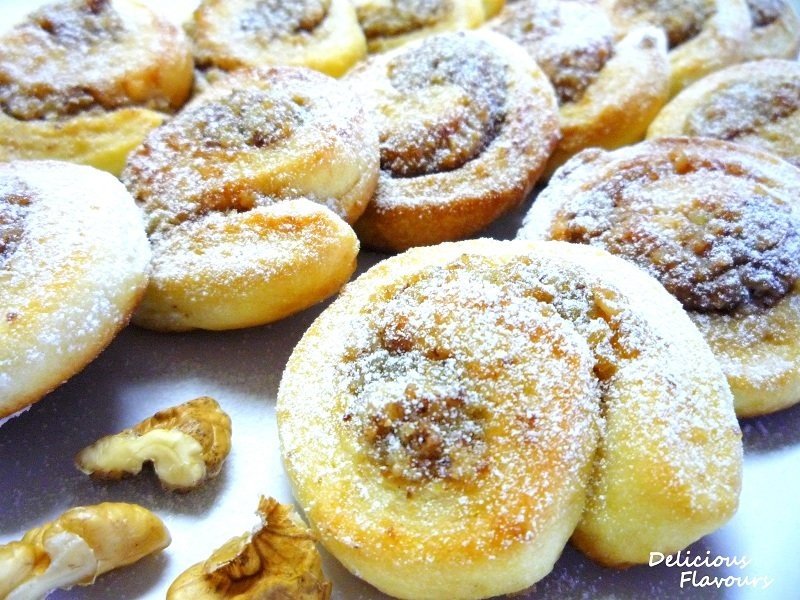 Impartim aluatul in 4 bucati egale si intindem aluatul foarte subtire sub forma de dreptunghi, il acoperim cu 1 strat de nuca lasand o margine de aproximativ 2 cm libera si apoi rulam. Cu un cutit bine ascutit taiem rulouri de 2-3 cm inaltime si le asezam in tava tapetata cu hartie, lasand spatiu intre ele pentru a putea creste.. Dam rulourile la cuptor, iar intre timp incalzim 200 ml lapte, adaugam zaharul si zaharul vanilat si amestecam pana cand acestea se dizolva. Cand rulourile sunt aproape gata (cam cu 5-10 minute inainte), folosind o pensula, stropim rulourile cu laptele caldut (de doua ori). Dam tava din nou la cuptor si lasam pana sunt gata.
