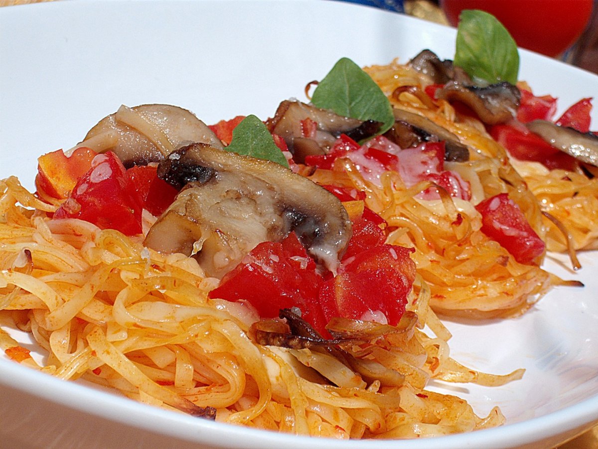 Rosiile se oparesc,se curata de pielita se dau prin razatoare si apoi se calesc intr-un pic de ulei Se sareaza dupa gust,se adauga si catelul de usturoi zdrobit si 2 -3 frunze de busuioc verde tocat fin sau un praf de busuioc uscat.Se amesteca sosul cu pastele fierte apoi se aseaza intr-o forma de silicon unsa cu un pic de ulei sub forma unor cuiburi in care presaram pe fiecare cascaval ras,ciupercile calite Se toarna si cate o lingura de sos de rosii si e dau 10 minute la cuptor.Se scot cuiburile cu grija din forma si le servim stropite cu sosul aromat din rosii.Acest sos se serveste si la preparate din peste prajit sau la cuptor.