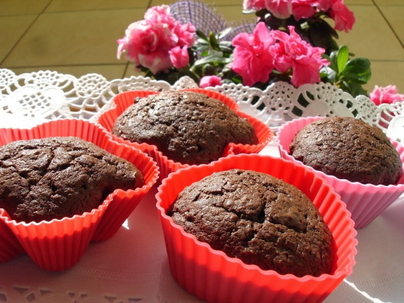 Ciocolata se topeste impreuna cu untul pe foc sau la microunde iar dupa ce s-a racit se amesteca cu romul si coniacul. Ghimbirul se rade prin razatoarea mica la fel si coaja de portocala si lamaie. Galbenusurile se bat cu coaja de citrice si putin zahar, albusul se bate spuma cu zeama de lamaie iar spre sfarsit adaugam restul de zahar treptat si mixam pana la dizolvare. Faina se amesteca cu sarea si praful de copt si se cerne o data. Punem peste albusuri ciocolata, uleiul, ghimbirul cu tot cu sucul ramas, nucile, ghimbirul confiat si faina cernuta. Amestecam usor sa incorporam ingredientele, punem din compozitie cam trei sferturi din forma ca sa aibe loc sa creasca si dam la cuptorul incalzit pentru aproximativ 30-35 minute dupa care facem testul cu scobitoarea. Nu trebuiesc lasate foarte mult ca sa fie pufoase si sa nu se intareasca. Rezultatul este unul pe masura, niste prajiturele cu o consistenta foarte pufoasa.Briosele se scot din forme dupa ce s-au racit complet pentru a ramane forma frumoasa. Siliconul este minunat mai ales pentru cupcakes. Ghimbirul este foarte sanatos mai ales in perioada de iarna asa ca pentru cei carora nu le place acest gust iute il pot manca foarte usor in preparate.