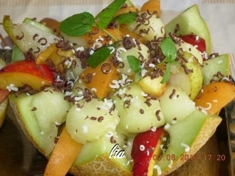 Luam un cutit cu varf, bine ascutit si sectionam pepenele galben in jumatate, in forma zimtata (pentru ai conferi un aspect mai placut). Cu ajutorul unui dispozitiv de scobit (sau cu o lingurita, in lipsa acestuia) scoatem tot miezul de pepene, in forme rotunjoare si-l punem intrun bol. Spalam restul de fructe si le taiem in felii, patrate sau cum doreste fiecare. Cele doua grapefruit-uri le stoarcem, sucul se va consuma separate, ca atare, iar cupele le vom folosim.