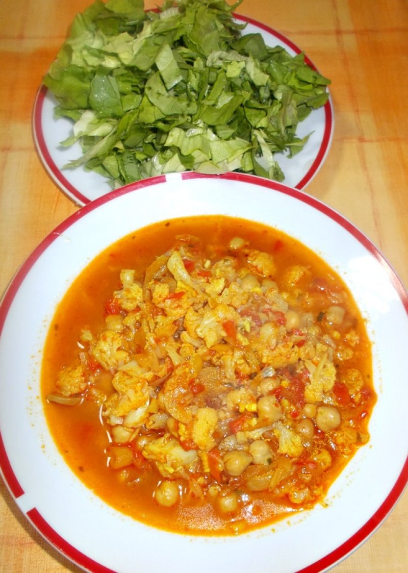 Adaugam rosiile cuburi si restul de supa si lasam 5 minute sa fiarba toate. Potrivim gustul de sare si piper. Conopida bine scursa de apa o adaugam la curry si o lasam sa dea in clocot, apoi stingem focul.