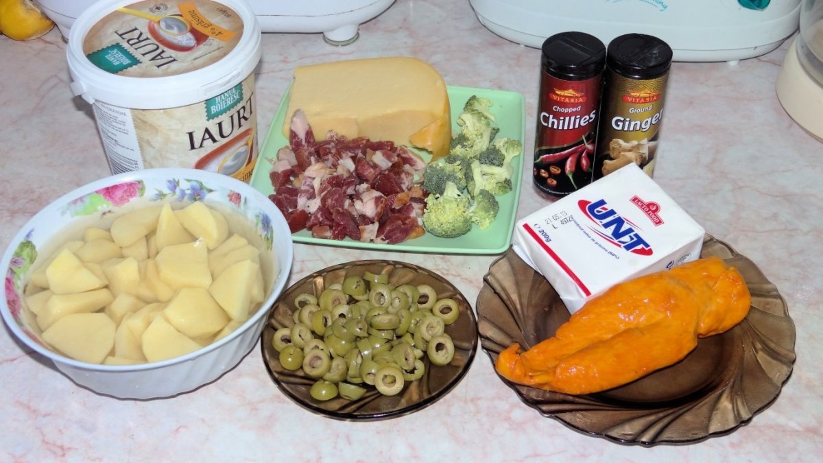 Intr-o tava de ceramica am pus aschiute de unt pe fund, cartofi felii si felii de piept de pui in randuri, am presarat ghimbir, am pus iaurt pe deasupra, am asezat maslinele verzi feliate si am ras cascaval pe deasupra. In alta tava de ceramica am pus aschiute de unt pe fund, un strat de felii de cartofi si un strat din bucatele de bacon crud uscat, am presarat chilli, am pus iaurt, am asezat brocoli rupt bucatele mici si am ras cascaval gouda. Inainte de a baga in cuptor am pus hartie de copt umezita pe deasupra la fiecare tava ca sa se faca cartofii inainte de a se arde cascavalul, am lasat 30 min, apoi am scos hartia ca sa se rumeneasca si am mai lasat aprox. 15 min.