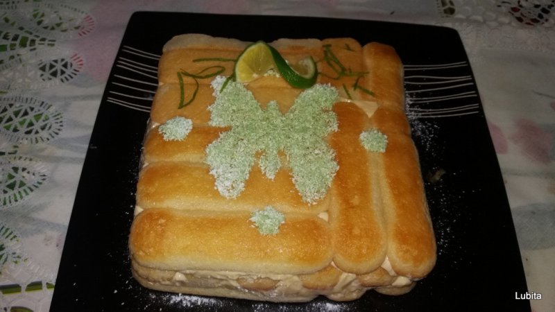 Intr-o forma tapetata cu folie alimentara,se pune un rand de piscoturi inmuiate in siropul de zahar cu lamaie,se umple toate golurile,deasupra se intinde jumatate din crema,se niveleaza,se acopera cu alte piscoturi inmuiate,apoi restul de crema,din nou piscoturi,se acopera cu folia ramasa pe margini si la frigider se lasa cateva ore sau pana a doua zi.