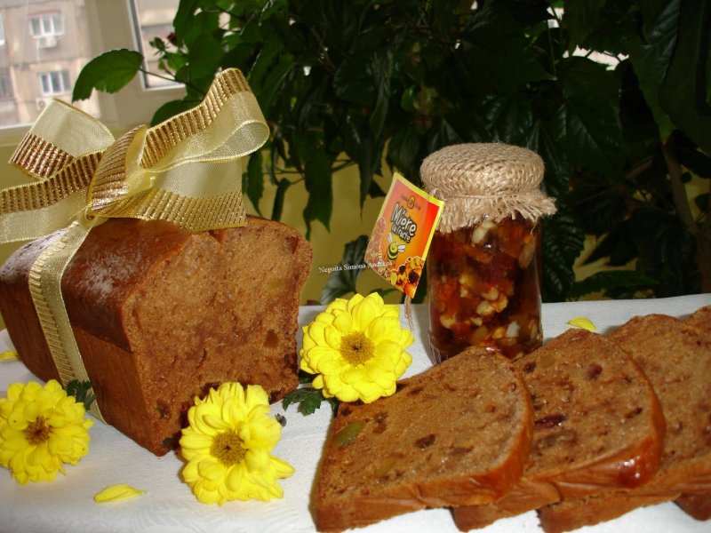 Faina se amesteca cu praful de copt, nucsoara si scortisoara. Oul se bate spuma, se amesteca treptat cu uleiul, laptele si apoi mierea. Se bate bine pana se topeste mierea. Se adauga cate 2 linguri de faina si se incorporeaza usor. Punem apoi fructele si omogenizam. Punem compozitia intr-o tava potrivita de chec si dam la cuptor pentru aproximativ 60 de minute, in functie de cuptor. Se lasa focul mic. Se face testul cu scobitoarea si cand e gata se scoate afara. Cand s-a racorit complet se scoate din forma. Este un chec delicious, combinatia aromelor de scortisoara, nucsoara, miere si fructe ii da un gust aparte.