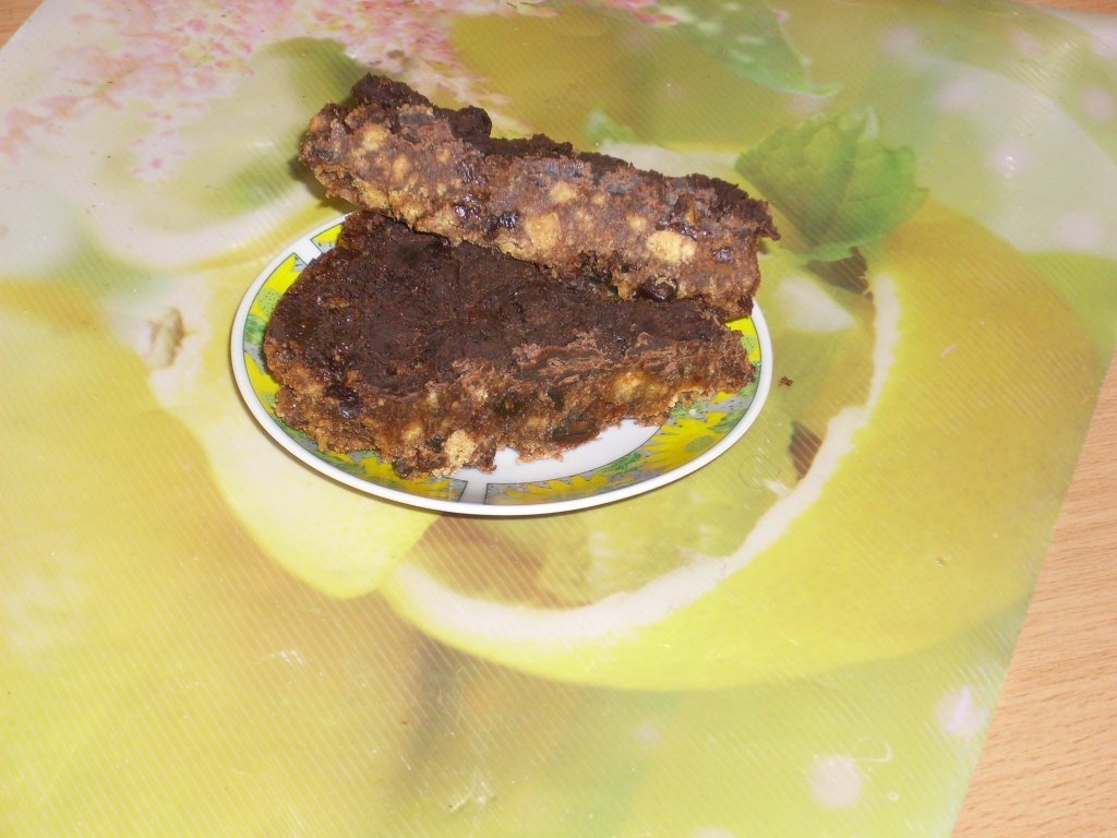 Se unge cu unt o tava rotunda cu diametrul de 17 cm. Se zdrobesc biscuitii cu un sucitor pana se obtin firmituri nu foarte marunte.Se topeste untul cu mierea intr-o craticioara sau se pot topi si intr-un castron la cuptorul cu microunde, se amesteca stafidele cu biscuitii si cu cacaoa si apoi cu untul topit.Se pune amestecul in tava unsa cu unt si se preseaza cu dosul unei linguri, netezind astfel suprafata.Se topeste ciocolata, fie pe baie de aburi, fie la cuptorul cu microunde si se intinde apoi pe suprafata prajiturii, apoi se da la frigider 30 minute.