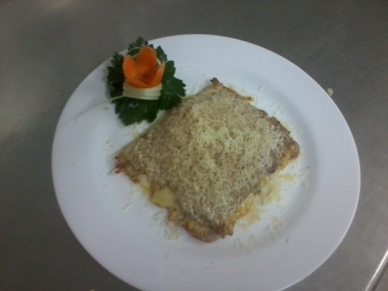 Muschiul se fasoneaza, se taie in doua parti egale si se bat cu ciocanul de snitele ,subtire. Se asezoneaza cu sare, piper si busuioc si se pune intr-o tava de marime adecvata unsa cu unt , prima bucata de carne si se rade 50 gr cascaval pe toata suprafata.se pune, ciuperca taiata felii mai groase,ceapa tocata,ardeiul cubulete si untul alifiat cu putina sare,marar si zeama de lamaie.se mai rade 50gr cascaval pe toate incredientele si se adauga a doua bucata de carne care se preseaza cu degetul pe margini. Se unge cu galbenusul de ou suprafata totala a carnii si se baga la cuptor 20 minute la 200 grade.se scoate si se rade cascavalul ramas(50gr). Preparatul "deliciu fracme" se poate servi si cald si rece cu anumite garnituri de legume urmat de un vin alb sec nobil cules tarziu. Pofta buna! Hanul-voievozilor.......
