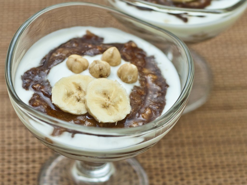 Peste ultimul strat de chefir punem felii de banane si presaram alunele.