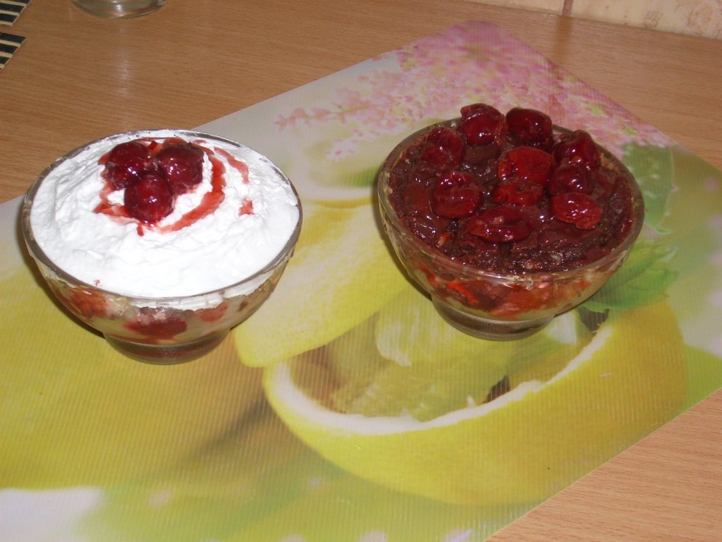 Se bate creme ole de ciocolata cu 100ml lapte si se pune intr-unul din boluri peste visine si deasupra de crema ornam cu cateva visine, apoi batem 50ml de frisca si punem in bolul ramas peste visine si cu restul de visine ornam si acest bol.