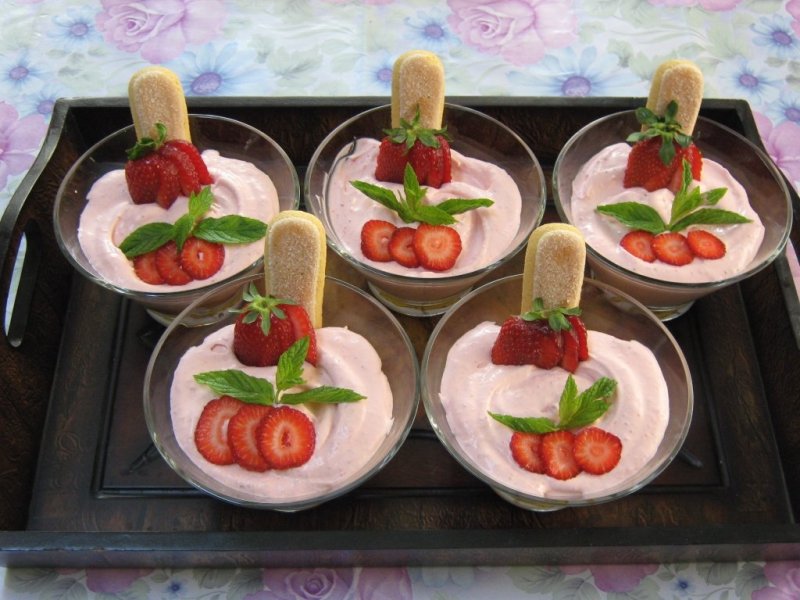 Se aseaza in fiecare cupa cate un piscot intreg si se toarna spuma de capsuni.
