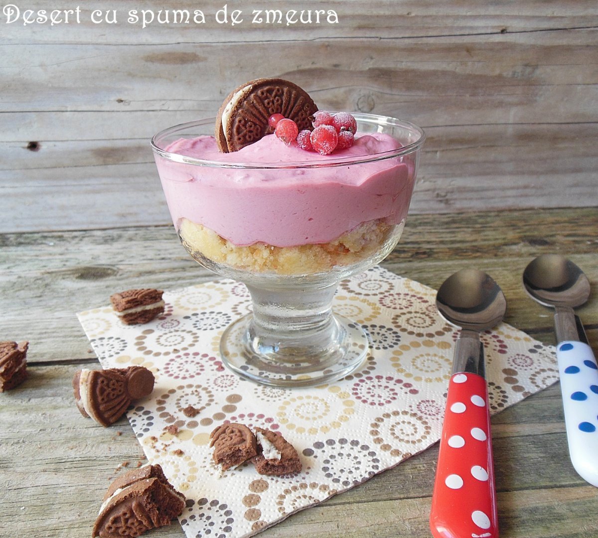 In cupe de sticla asezam un strat de blat faramitat, apoi spuma de zmeura.