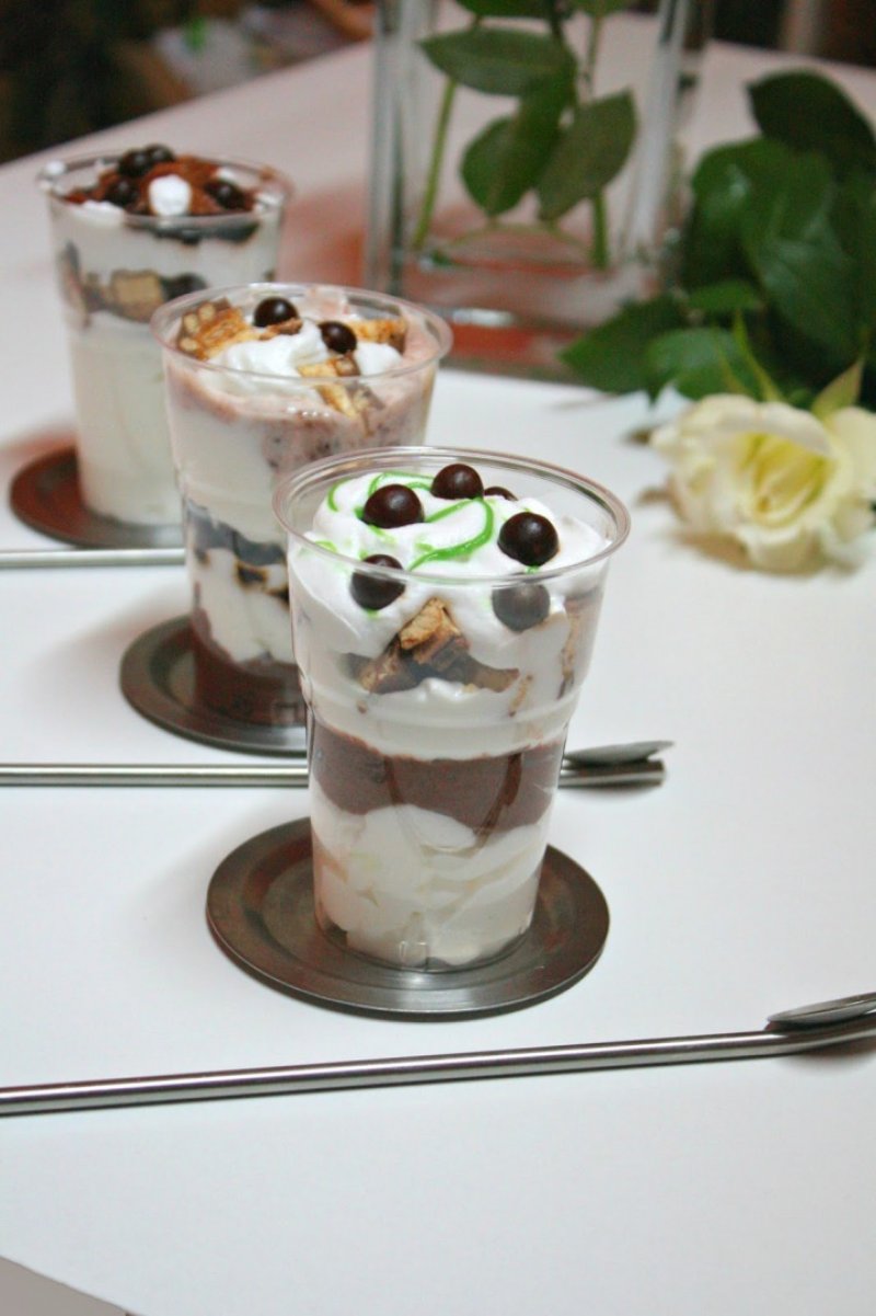 Si acum sa ne jucam putin cu imaginatia! Eu am amestecat 3 linguri din frisca cu 2 linguri de cacaua; 2 linguri din frisca cu dulceata; am batut 50ml frisca lichida pana am obtinut o spuma tare.Eu am aranjat paharele astfel,dar voi faceti-va de cap si faceti si alte variante: