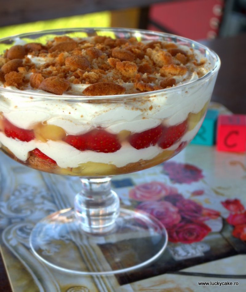 Adaugam laptele, trebuie sa aiba consistenta unei smantani groase, daca e nevoie mai adaugam 2-3 linguri lapte, apoi amestecam cu frisca. Capsunele le taiem in jumatate sau sferturi.Intr-o cupa mai mare punem 2 linguri mascarpone, apoi 4 biscuiti sfarmati, apoi jumatate din mere si capsuni, continuam din nou cu crema de mascarpone, apoi un strat de biscuiti sfarmati nu foarte marunt, fructele ramase, iar deasupra mascarpone si biscuiti.