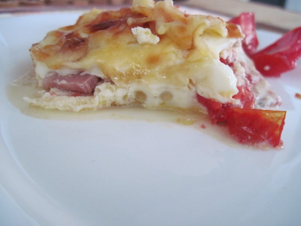 In aceeasi tigaie se caleste putin si sunca/kaizer-ul taiata bucatele si se aseaza peste rosii, apoi ardeiul iute se taie rondele micute si se caleste foarte putin, punandu-se apoi peste sunca.