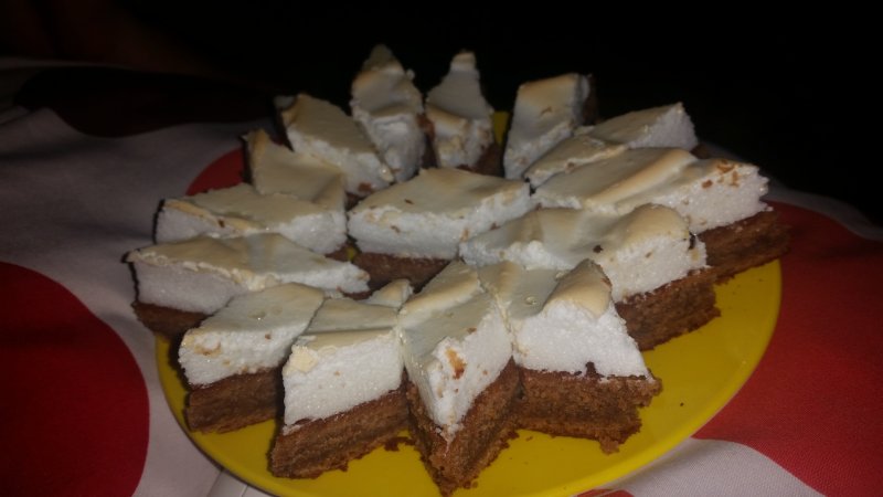 Albusurile se bat bine spuma cu cele 150 g zahar. Se intinde spuma pe prajitura calda si se mai tine tava in cuptor cam 10 minute la foc ceva mai mic. Se taie in cuburi mari si se poate manca chiar si calduta.