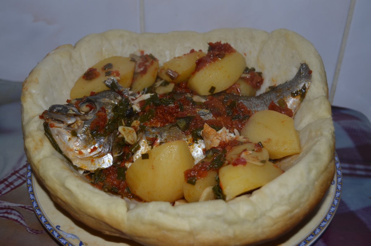 Se pune pestele intr-o tava, cartofii curatati si taiati in doua, toate ingredientele si la final se adauga apa.