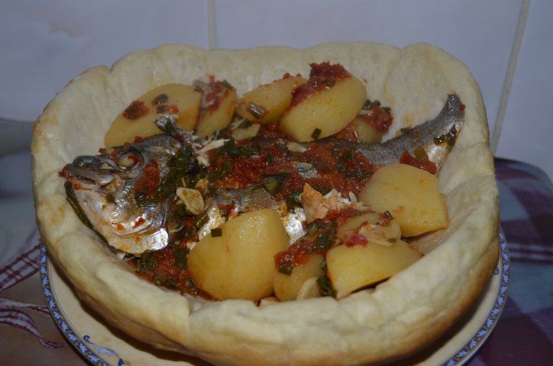 Se taie o hartie de copt de marimea unui castron de inox care are diametrul tavii in care s-a pus pestele,se pune aluatul peste hartie si hartia peste castronul de inox,cu ajutorul palmelor inmuiate in ulei se intinde aluatul peste castron,se pune castronul peste tava si se da tava la cuptor la foc potrivit.Se lasa pana se coace frumos coca dupa care se scoate castronul si daca pestele nu este inca facut,se mai lasa la cuptor pana cand este gata.Cand este gata se pune pestele in vasul de paine si se poate servi.Sa aveti pofta si la pofta dragilor!