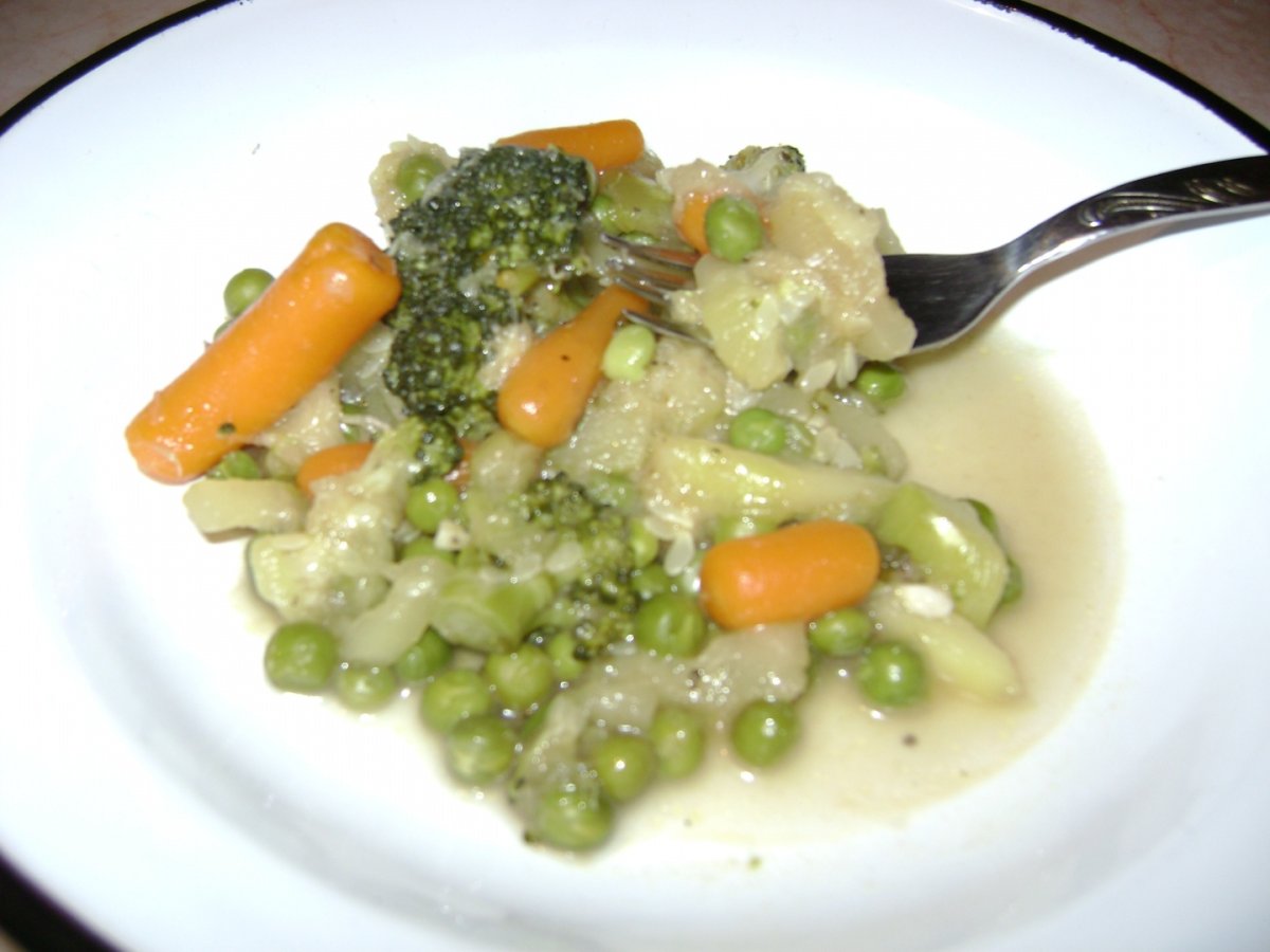 Se pune putin ulei in tigaie, se adauga ceapa, peste care se presara putina sare si piper, se lasa 1-2 minute la foc mediu, apoi se adauga si ursturoiul. Se pune apoi dovlecelul, peste care se pune putina sare si se amesteca, apoi se adauga restul legumelor. Cand toate legumele sunt in tigaie se toanca 2-3 cani de apa(cat sa nu treaca peste legume complet), se acopera si se lasa la foc pentru aproximativ 40 de minute, pana legumele sunt gatite, dar nu fara sa fie sfarmate sau prea moi. Cu 5-10 minute inainte sa fie totul gata, se mai condimenteaza, daca se doreste. Eu am pus putin rozmarin macinat, oregano, busuioc si boia.