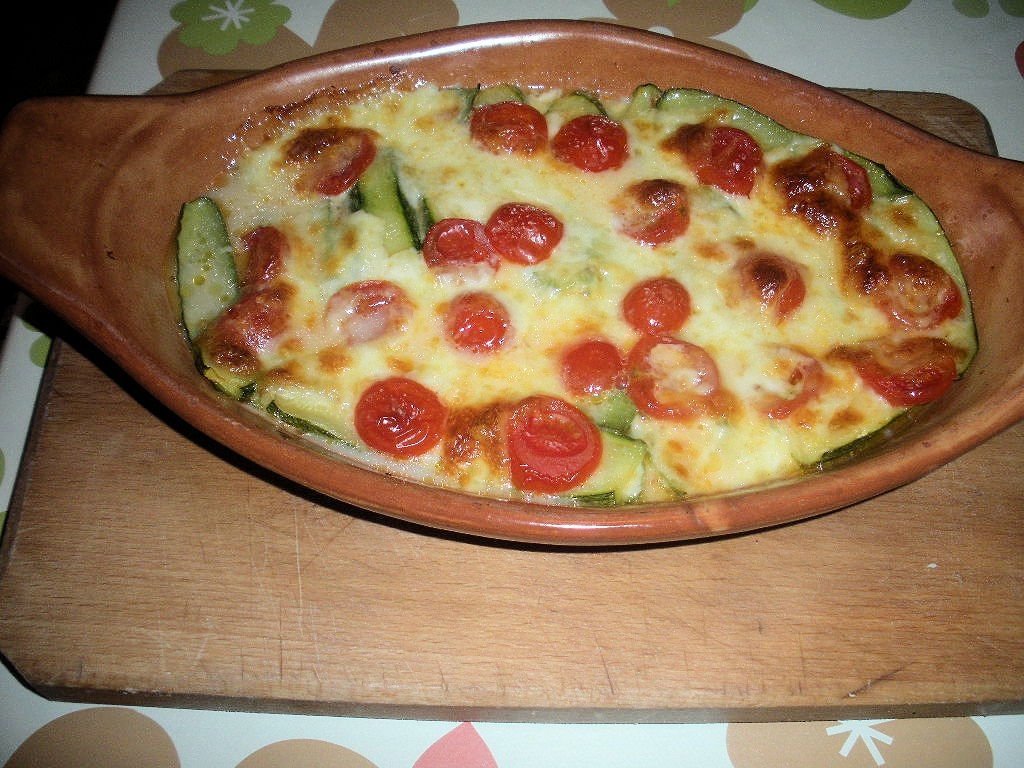 eu am folosit o tava de pamant pe care am uns-o cu ulei,am asezat un strat de dovlecei,un starat de rosii ,un alt strat de dovlecei si unul de rosii ,iar la sfarsit stratul de mozzarella,introducem in cuptorul cald cam 15 minute si pofta buna!