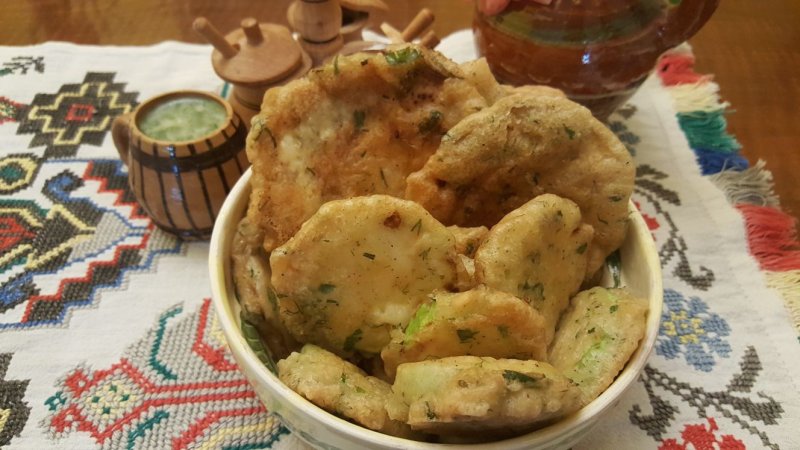 Se taie dovleceii și vinetele rondele de aproximativ 1 cm, se sărează și se lasa sa stea 20-30 min. Apoi se spală și se acoperă cu făină. Faina rămasă se combina cu ouăle bătute, muștarul, sare și piper după gust și mărar pana are textura unei smântâni groase, dacă mai este nevoie, adaugandu-se apa. Se dau legumele prin acest amestec și se prăjesc în ulei și se savurează împreună cu mujdei, salata de castraveți sau ardei copți.