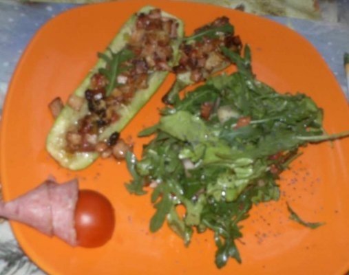 Se trece la umplerea dovleceilor cu acest amestec. Ungem o tava de cuptor cu putin ulei si asezam dovlecei, se sareaza si pipereaza, radem branza sau parmesan si dam la cuptor 20 de minute. Incercam sa vedem daca dovleceii s-au facut, daca consideram ca sunt gata se pot scoate si servii alaturi de o salata asortata(de rosii,salata verde sau combinata).