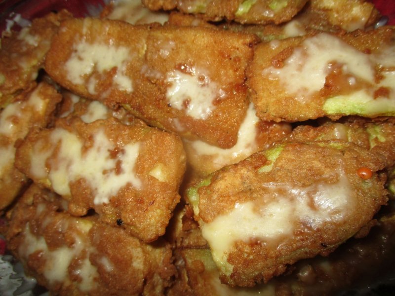Când am terminat, punem uleiul la încins. Prăjim feliile de dovlecel la foc mediu, aşezate în cratiţa cu ulei atâtea câte încap, fără să se suprapună, şi le întoarcem pe ambele părţi, până se auresc şi se închid puţin la culoare fără să se ardă, să se înnegrească, apoi le scoatem cu o paletă într-un vas cu strecurător pentru a se scrurge surplusul de ulei. După fiecare tranşă, înainte să o scoatem pe următoarea, mutăm feliile într-un vas termorezistent, de tip yena, astfel ca să nu se terciuiască în strecurătoare dacă sunt prea multe, până sunt fierbinţi. Dacă dorim, putem pune puţin parmezan sau caşcaval ras, sau mozarella rasă, pe fiecare felie, atunci când o aşezăm în vasul final, şi punem imediat capacul ca brânza să se topească la căldura degajată.