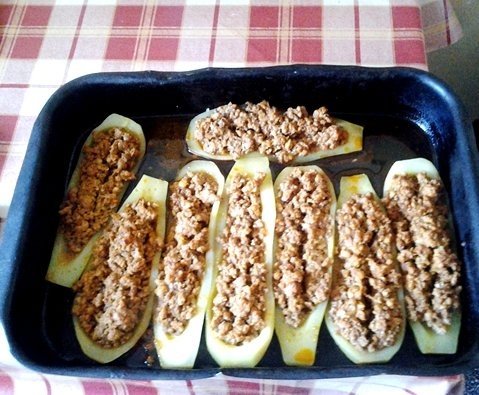 Se spala si se sterg cu un prosop de bucatarie jumatatile de dovleac. Se aseaza in tava si se umplu cu carne.Se adauga putina apa, in tava pentru a nu se arde dovleceii, in timpul coacerii. Se da la cuptor 35-45 minute, se se moaie dovleacul.
