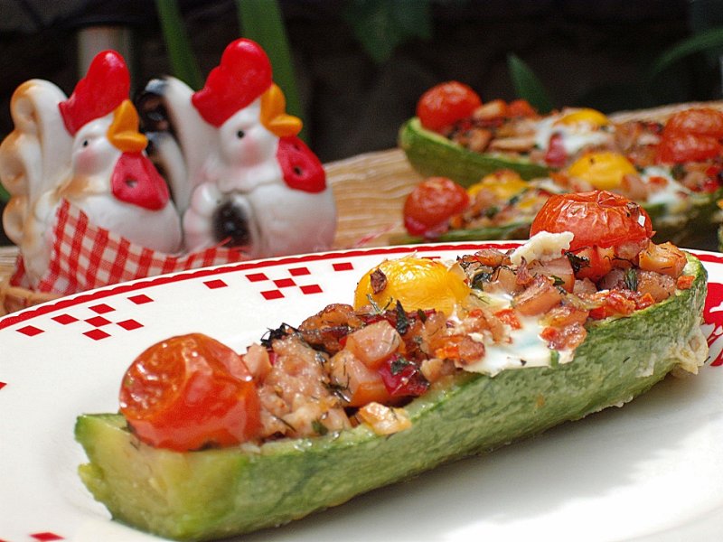 Se incinge un pic de ulei apoi se caleste ceapa si ardeiul taiat marunt,se adauga carnea tocata si pieptul afumat,taiat cubulete mici,se potriveste de sare si piper..Se da de pe foc si se adauga verdeata tocata fin.Se umple fiecare jumatate de dovlecel cu aceasta umplutura apoi se aseaza una langa alta intr-o tavita.Deasupra umpluturii a fiecarei jumatati se pun cate doua jumatati de rosii sherry si se leaga compozitia cu cate un ou de prepelita spart deasupra fiecarei jumtati.In tava se pune apa cu un praf de sare,un pic de ulei de masline dar si ingurita de legume deshidratate,pana la buza jumatatilor si se da la cuptor pana ce se coc ouale de prepelita .Se servesc calzi sau reci,simpli sau cu smantana deasupra.