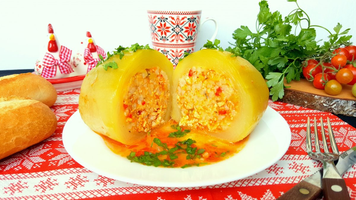 Dovleceii umpluti cu piept de pui si teci de fasole se servesc cu patrunjel verde tocat.