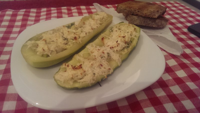 Intr-un bol separat se adauga branza de vaci sau iaurtul, ceapa, usturoiul, sare, piper. Se amesteca totul cu miezul dovleceilor. Se umplu jumatatile de dovlecel cu amestecul obtinut si se adauga deasupra telemeaua de oaie rasa. Se baga la cuptor la 160 grade timp de 15-20 de minute sau in functie de preferinte. Se serveste ca si garnitura sau simplu cu salata verde.