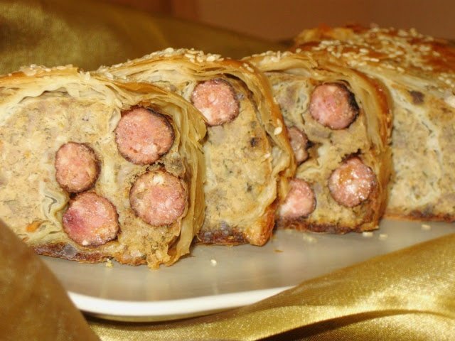 Se ia fiecare foaie de placinta(eu am folosit 6 foi) si se ung cu unt iar apoi punem foile una peste alta .Cu ajutorul unei linguri punem o portie din cantitatea de amestec la unul din capetele foilor de placinta apoi nivelam bine cu dosul lingurii si rulam dupa care punem carnaciorii,rulam din nou si apoi punem a doua portie din amestecul de carne.Rulam si strangem bine .Din amestecul de mai sus mi-au iesit 2 rulouri .Se ung rulourile cu ou batut si se presara cu seminte de susan.. Se aseaza ruloul intr-o tava de chec tapetata cu hartie pergament si se da la cuptor pentru circa 20 min.(iar ma repet.......depinde de fiecare cuptor in parte) Se scoate din cuptor