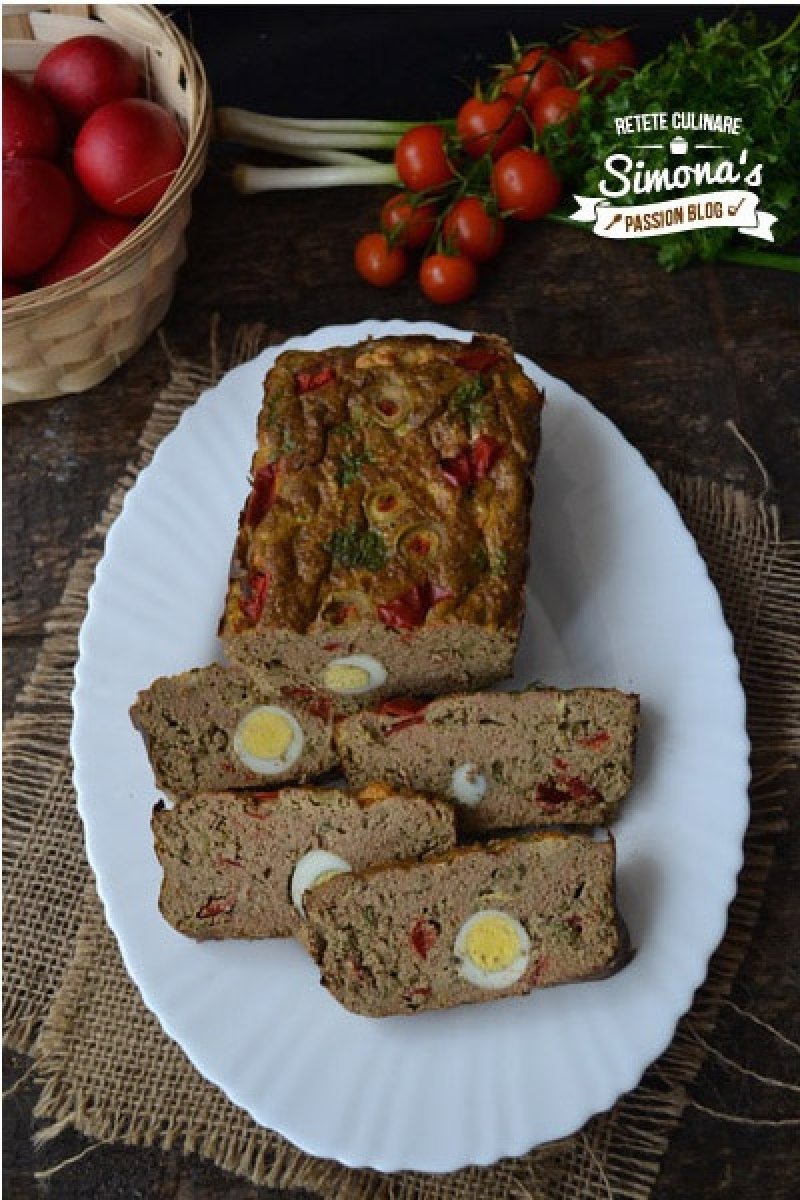 Compozitia obtinuta se pune intr-o tava tapetata cu hartie de copt, se adauga deaspra un ou batut, se niveleaza cu grija, apoi se decoreaza cu cateva masline verzi taiate felii, gogosari, patrunjel verde si se da in cuptorul preincalzit la 180 grade aproximativ 50 - 60 minute.