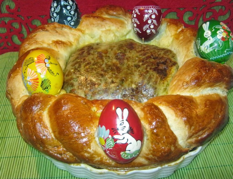 Din aluatul obtinut, facem o cununa impletita in doua, pe care o punem pe margimea tavii, imprejurul drobului. Ungem coronita cu galbenus si punem cateva oua din lemn invelite in folie.