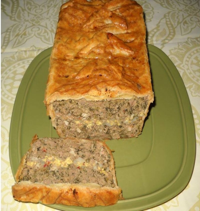 Aluatul de foietaj se intinde putin cu sucitorul si se aseaza intr-o tava ( eu am folosit un vas termorezistent de 23x13x7 cm) . Se lasa marginile mai mari ,sa atarne peste marginile tavii . Se aseaza jumatate din compozitia de carne si ficatei , se pun ouale fierte, taiate cubulete si se acopera cu restul de amestec. Marginile de aluat se taie fasii de cca. 1 cm latime si se aduc una peste cealalta deasupra. Se unge aluatul cu galbenus de ou si se da tava la cuptorul incalzit, pentru cca o ora, la foc mediu. Cand se raceste, se feliaza.