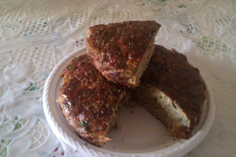 Luăm o tavă, punem hârtie de copt în tavă, o ungem cu puţin ulei si turnăm din compoziţie, lăsând tava goală de două degete. Deasupra compoziţiei turnăm un ou bătut şi acoperin bine compiziţia dn tavă, apoi introducem tava la cuptor, la foc potrivit. Lăsăm să se coacă drobul până se rumeneşte, făcând testul cu sconitoarea pentru a vedea dacă e copt. Când e gata, scoatem tava din cuptor şi lăsăm drobul să se răcească în tavă.