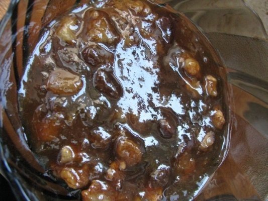2. Dupa cele 40 minute, se adauga stafidele si miezul de nuca in dulceata, se amesteca si se mai lasa pe foc 5 minute.