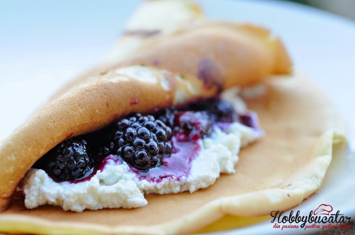Fructele se pun in tigaia incinsa in care ai preparat clatitele, cu 2 linguri cu varf de Green Sugar la 1 pahar de fructe. Se amesteca pe foc, pana se topeste zaharul. Cand crapa afinele si coacazele, lasand sirop, se adauga sucul de la 1/4 de lamaie, apoi se amesteca si poate pune dulceata peste clatitele fierbinti. Pentru un mic dejun cosistent, umplutura e si cu branza de vaci. Aici, un pahar de fructe la 2 clatite.