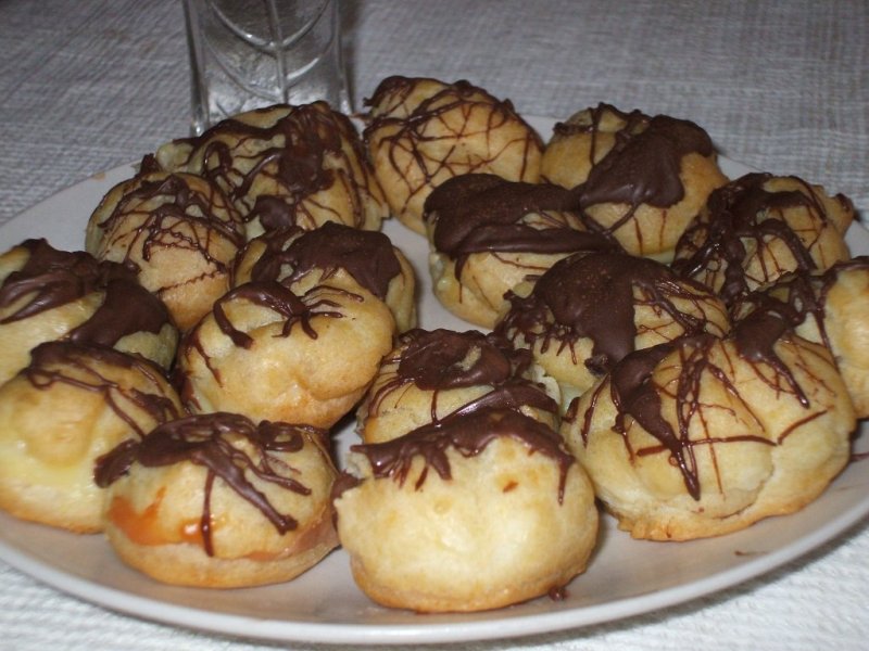 Intr-o tava neunsa se pun bilute cu lingurita la o distanta de 2cm unele de altele.Cuptorul trebuie sa fie incins la maxim dinainte.Cuptorul nu se deschide 20 de minute sub nici o forma altfel nu vor mai creste si vor ramane cleioase la mijloc.Aceste preparate trebuiesc sa fie goale la mijloc.Se coc 30 de minute.
