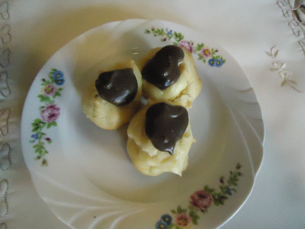 - Intr-un vas in care fierbe o ceasca de lapte, adaug amestecul omogen de:oua,faina, vanilie, zahar si o ceasca de lapte.Amestec, cu telul spiralat sa nu se prinda de fundul oalei, pana obtin o compozitie de consistenta vartoasa. Iau de pe flacara, adaug untul, amestec pana se omogenizeaza. Cand crema e racita,dar nu complet, o folosesc la umplut bilele coapte. Fie cu ajutorul spritei, a unui pos sau chiar a unei lingurite.